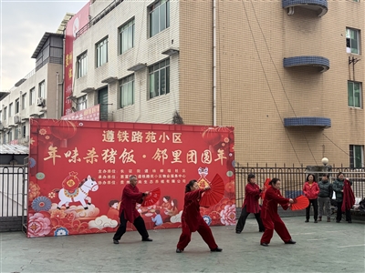 1月5日,红花岗区长征街道杨柳堰社区在遵铁路苑小区广场上举办“年味杀猪饭·邻里团圆年”新年民俗活动,数百名居民欢聚一堂进行游戏互