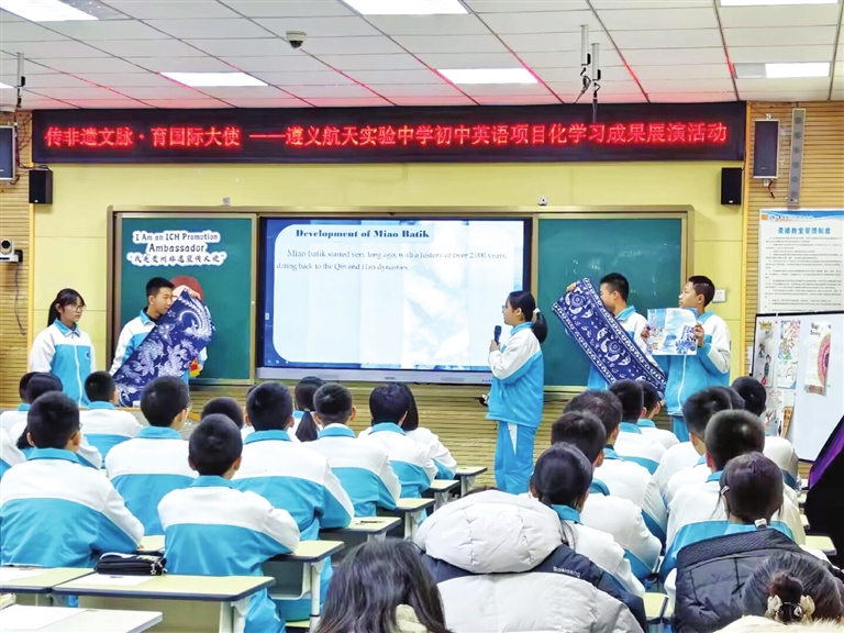 1月6日,遵义航天实验中学开展了题为“传非遗文脉 育国际大使”的英语教学活动,同学们化身“非遗宣传大使”,走上讲台,用英语介绍家乡的非物质文化遗产。